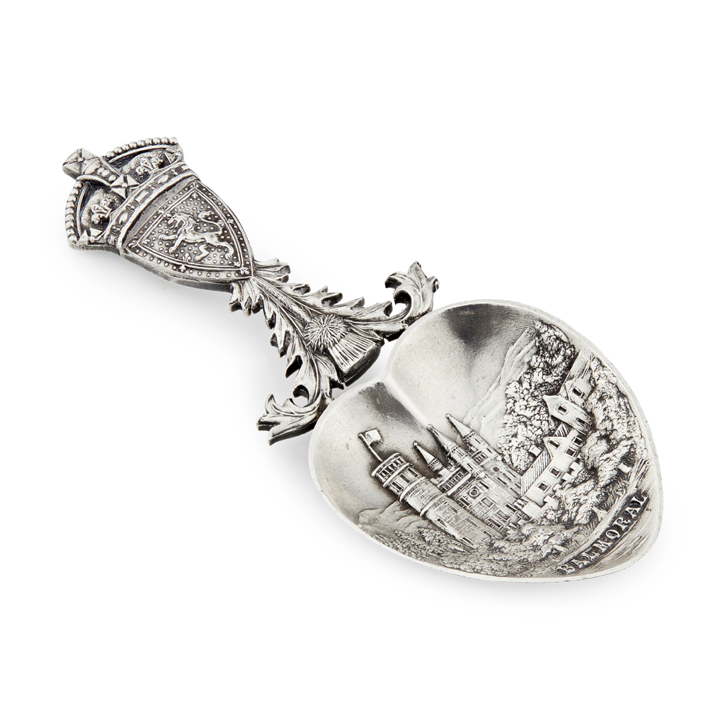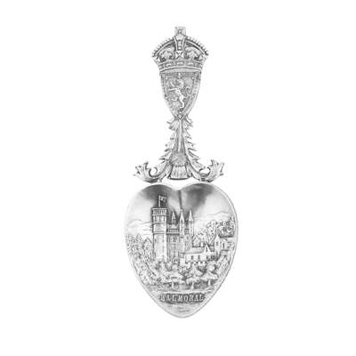 marked ROBB / BALLATER, Edinburgh 1906, the heart shaped bowl with chased scene of Balmoral Castle, with thistle stem and crowned shield terminal