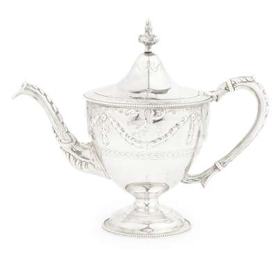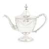 marked T&H, Glasgow town mark, of tapered urn form with chased scroll bride, acanthus swags and foliate girdle, the curved spout with cast details, with hinged domed cover with cast finial and C scroll handle, raised on a pedestal foot with beaded edge