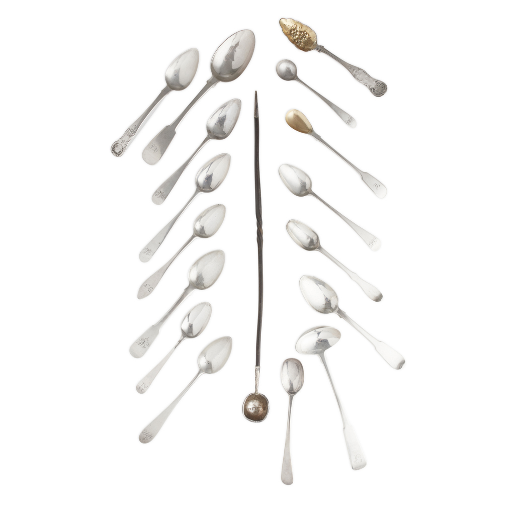 marked F&M, camel, INVSS, the diminutive bowl with socket attachment to baleen handle; together with collection of Edinburgh and provincial silver spoons (qty)