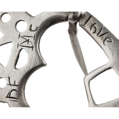 of conventional open heart form with intricate pierced 'crown' surmounting, engraved to reverse DF Mc LOVE; together with another similar with maker's mark er (2)