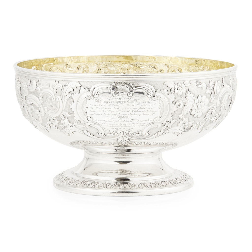 the hemispherical bowl with cased borders of trailing flower heads within foliage, with large rococo scroll cartouche with presentation inscription' 'Presented to William Tomlinson Esq., London by Alexander McWhinnie, John McWhinnie & Mrs Nicholas Scott, surviving children of Agnes Nairn, wife of Gilbert McWhinnie, Glasgow, and sister to the late George Nairn of Queen Street, London, as a memorial of respect from them being an old acquaintance of their uncles, also for his attention in their interest at the final settlement of his affairs, Glasgow Novr. 1828.', raised on an inswept stem and spreading foot with chased foliate rim