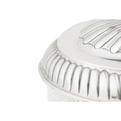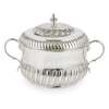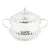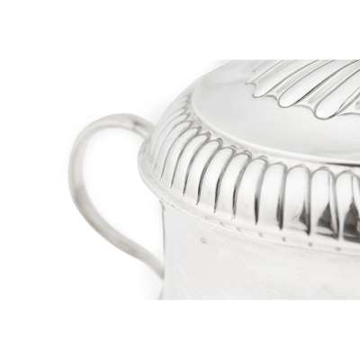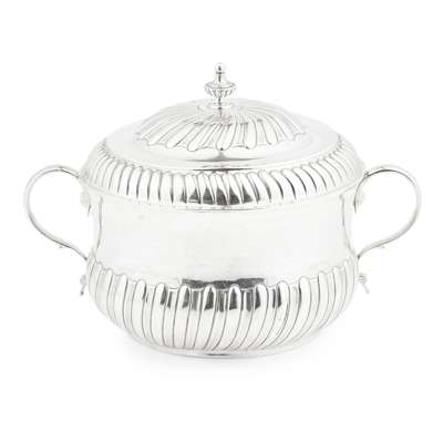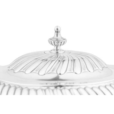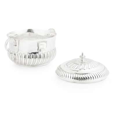 of traditional form, two loop handles, demi-fluted body, with similarly decorated lid and finial of knopped form, later Breadalbane marked to base and cover
