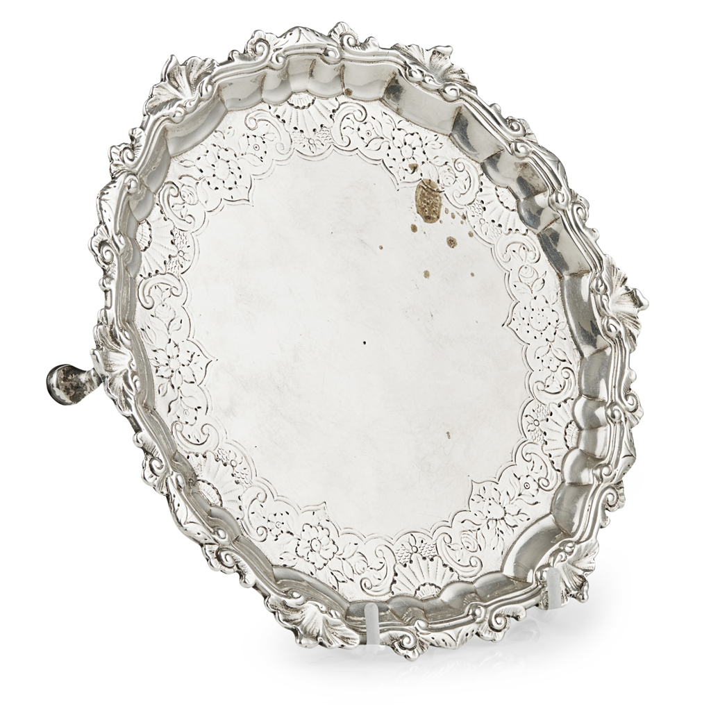 Assay Master Hugh Gordon, of shaped circular outline with cast foliage and scroll border, the centre with chased foliage and scroll border, raised on three hoof feet