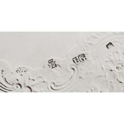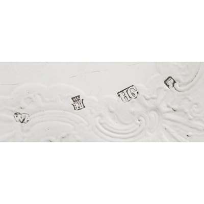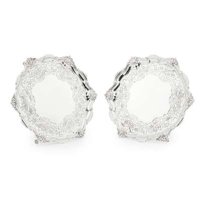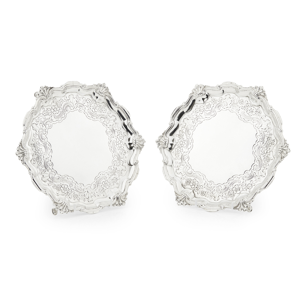 Assay master Hugh Gordon, Edinburgh 1748, of shaped circular outline, scroll and shell border, the flat with engraved border, foliate, shell and scrolls, raised on three hoof feet, initialled H to underside of base and with engraved scratch weights (2)