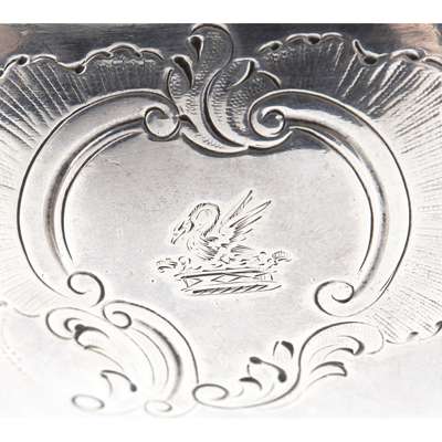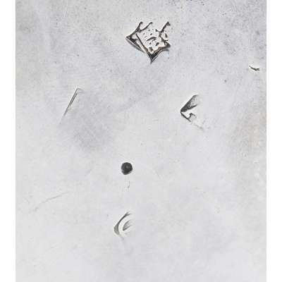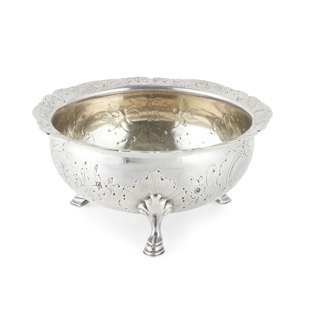 the slight baluster body with scalloped everted rim, shell rocaille and scroll decoration, the body with later chased floral garlands, raised on three scroll and hoof feet