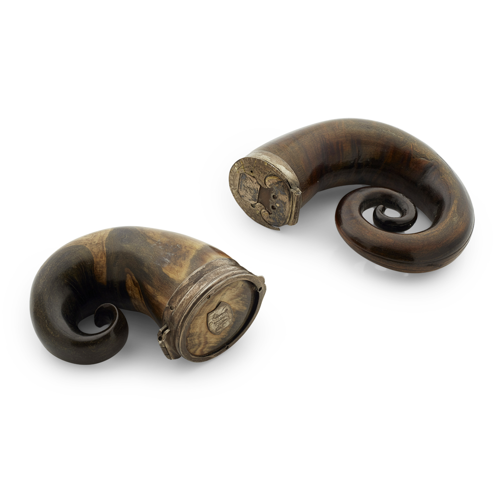 A LARGE EIGHTEENTH CENTURY WHITE METAL MOUNTED CURLY HORN MULL
