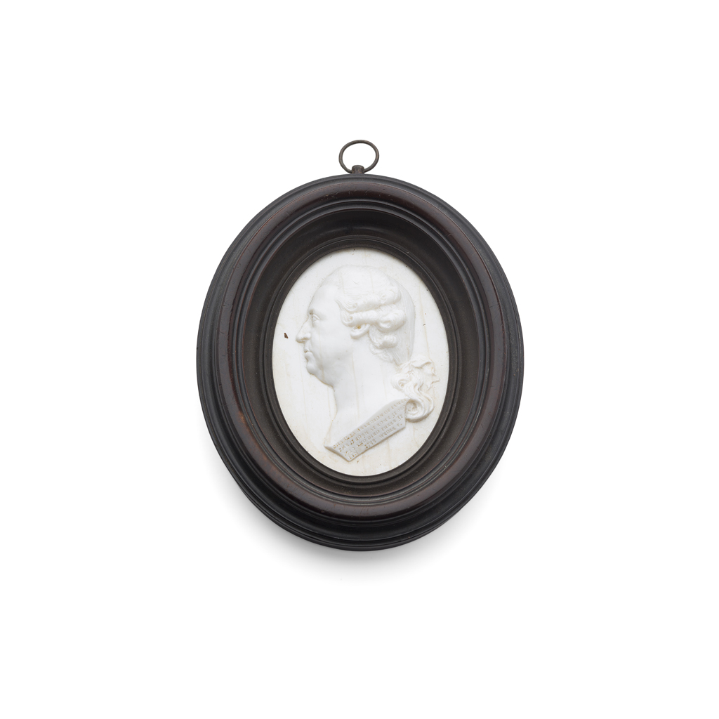 the white glass medallion with profile bust of Prince Charles, inscribed to neck 'Charles grandson of James II born at Rome 31st de 1720 and died there 31 Jan 1788' signed Weder, in oval wooden frame and mount