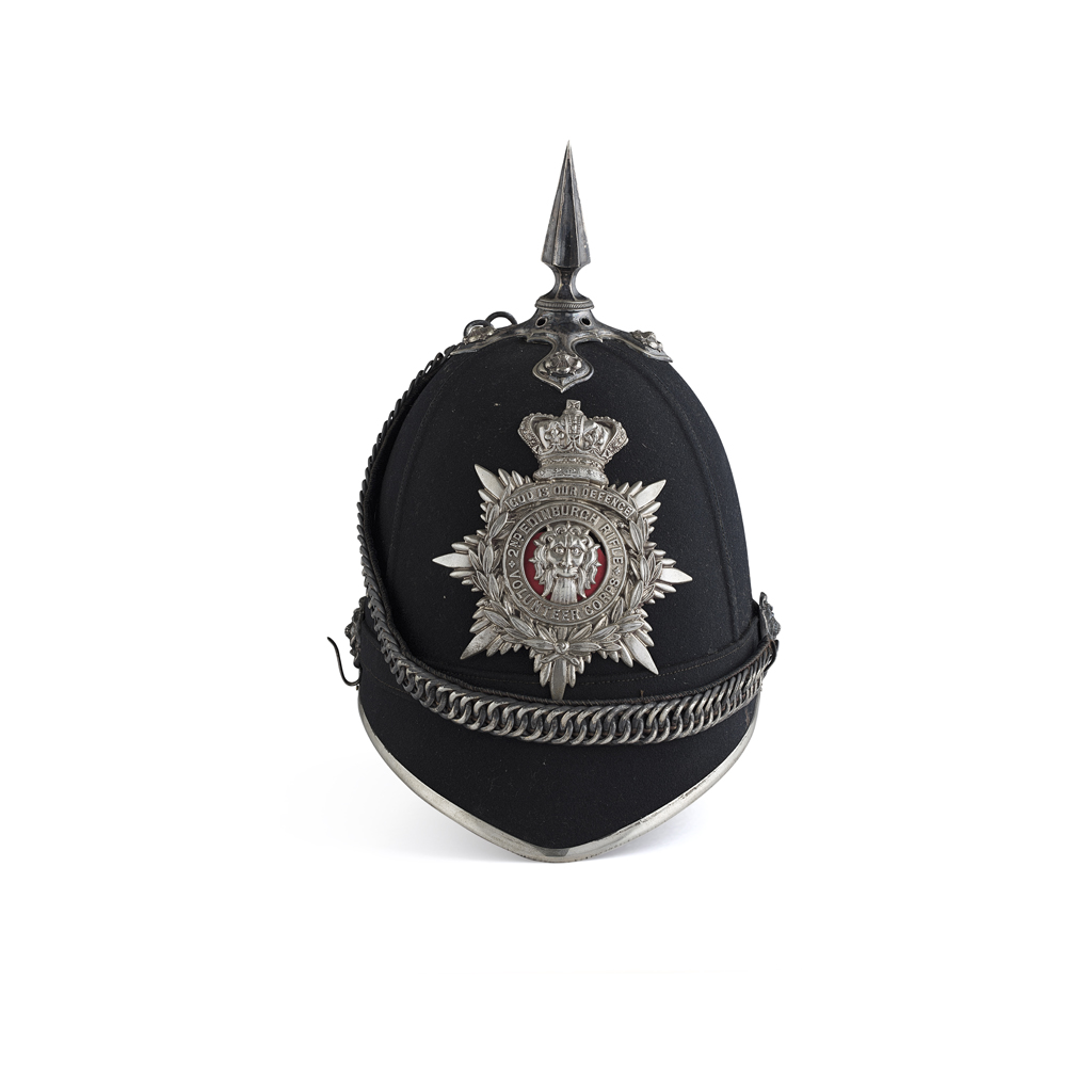the black cloth helmet of tradition form with plated spike, and chain chin strap, applied with regiment plate to front, the leather and silk interior inscribed 'Hill Bros military outfitters London'