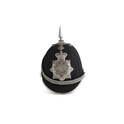 the black cloth body with applied plated mounts, spike and chin strap, applied regimental badge, silk and leather interior with tailor's name 'Ascher'