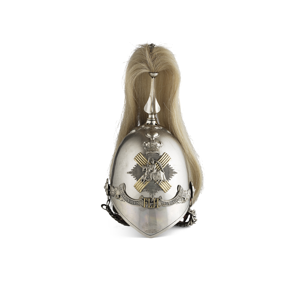 the all metal helmet with applied regiment badges with gilt brass highlights, with original horse hair plume, the chain link chin strap with traces of red silk lining, with leather interior