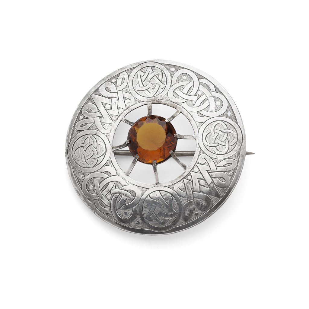 unmarked but tests as silver, the annular plaid brooch with engraved Celtic knotwork the centre with a raised claw set paste, engraved to reverse 'Luit James Deans, 2nd 21st AHRV'