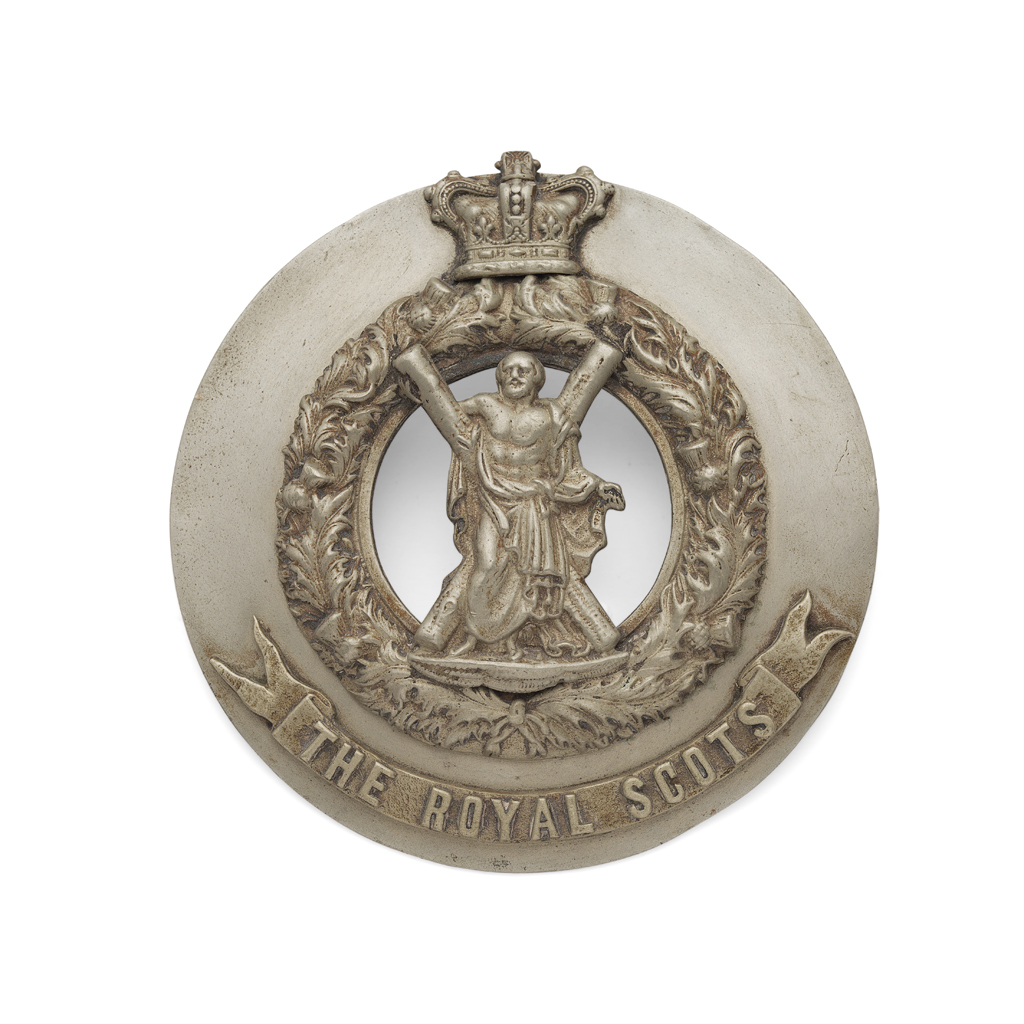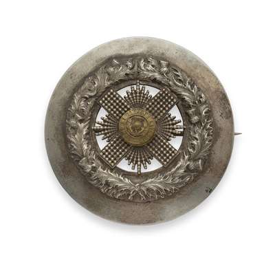 one large example with applied crown, thistle border and regimental name with St Andrew on cross, engraved to reverse '3RS / I' and marked to R & H B Kirkwood; together with two small examples with thistle border and applied two colour regimental badge, one by R & H B Kirkwood, the other J Stewart & Sons (3)