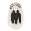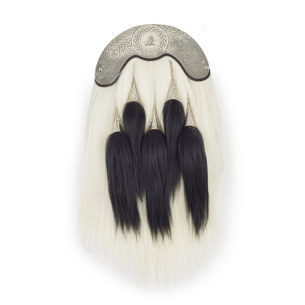 unmarked, the large arched cantle with finely engraved Celtic knot work flanking a central circular cartouche with engraved crest, the white goat hair body with five black goat hair tassels, matching engraved silver bells, tooled leather body and pocket to reverse