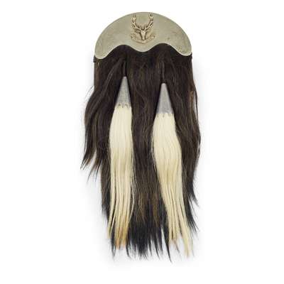 the white metal cantle engraved with thistle displays flanking an applied regimental badge, the black horse hair body with two white horse hair tassels with matching engraved bells, morocco leather body and pocket to reverse