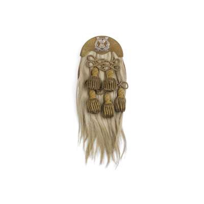 the arched cantle with engraved thistle displays surrounding an applied silver regimental badge, the white horse hair body with five knotted bullion tassels, red morocco leather backing