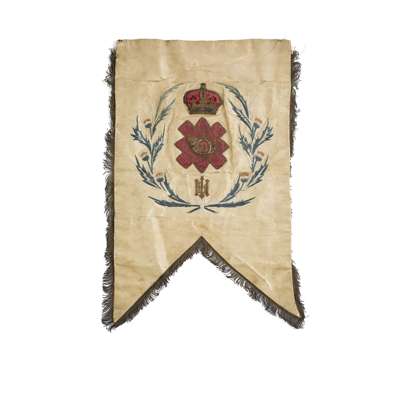 the silk pennant embroidered to one side with crown, regimental badge and cipher with thistle sprigs, the reverse with crest motto and initials of commanding officer, the whole with gold fringed border