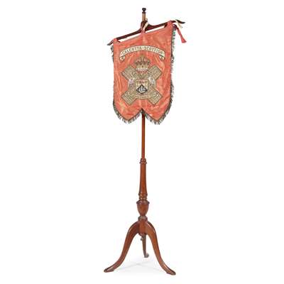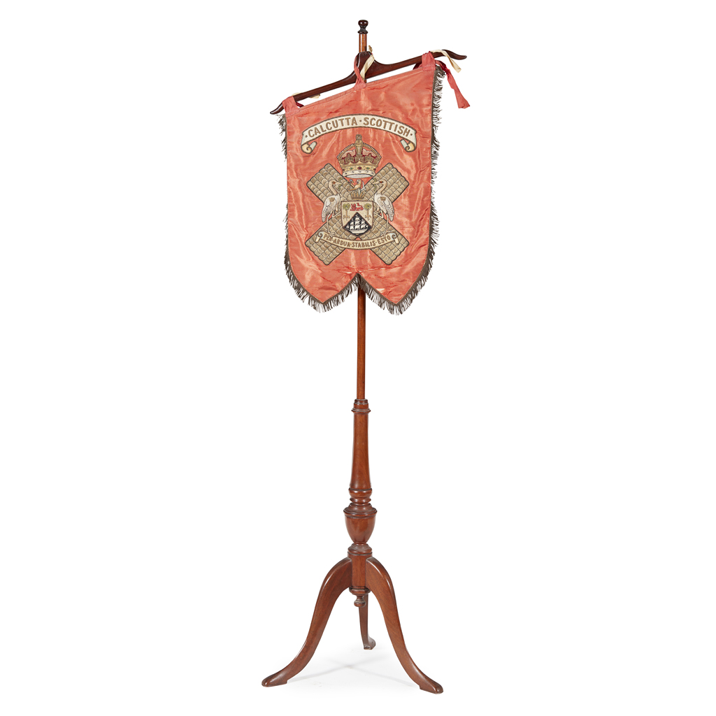 gold and coloured threads on a silk ground, bearing inscription CALCUTTA SCOTTISH inscribed with the motto PER ARDUA STABILIS ESTO (Be firm through difficulties), and to the reverse with a coat of arms for Richardson, later mounted on an early 19th century mahogany pole screen, adapted