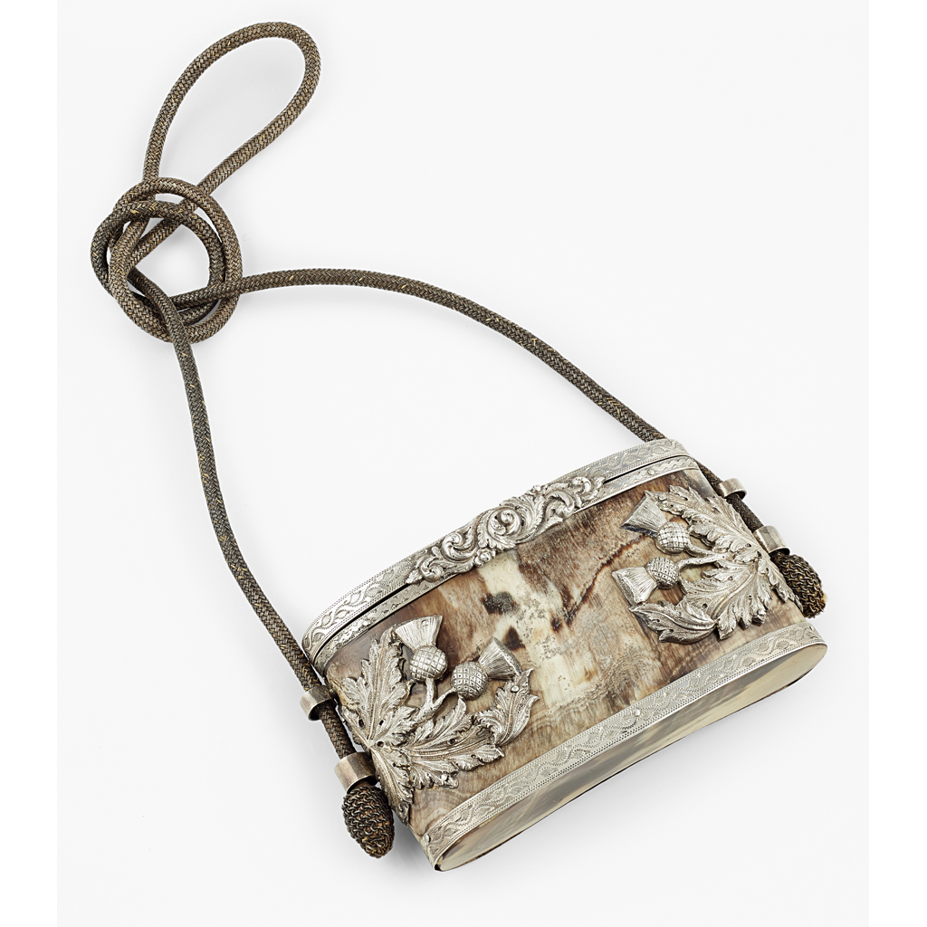 the curved rectangular body formed of polished cow horn with engraved border and rim, with fine detail of clasped thistle spays, suspended from a silver bullion cord, the interior with six cylindrical division for cartridges