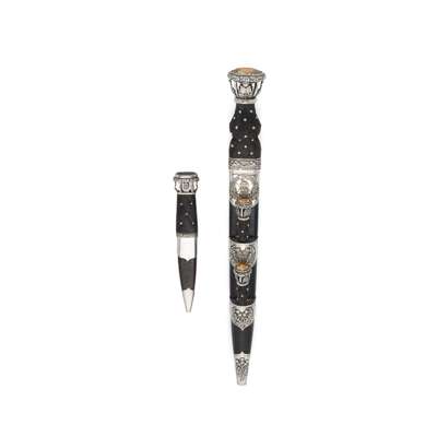 the sgian dubh fully hallmarked, the dirk makers mark only, the dirk with black wood baluster handle with silver studs, the oak leaf gallery with collet set foil backed crystal, the leather covered scabbard set with bi knife and fork with applied thistle mounts and regimental badge; with matching sgian dubh (2)
