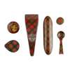 comprising a SPECTACLE CASE, containing a pair of white metal spectacles, 15.5cm long; a SCISSORS CASE, containing three steel scissors, Stuart tartan 17cm long; a SPOON, Stuart tartan, 9.5cm long; a BROOCH, 5cm diameter; a POCKET MIRROR, Princess Louise tartan, 6cm across and a ROUGE POT, 3cm diameter (6)
