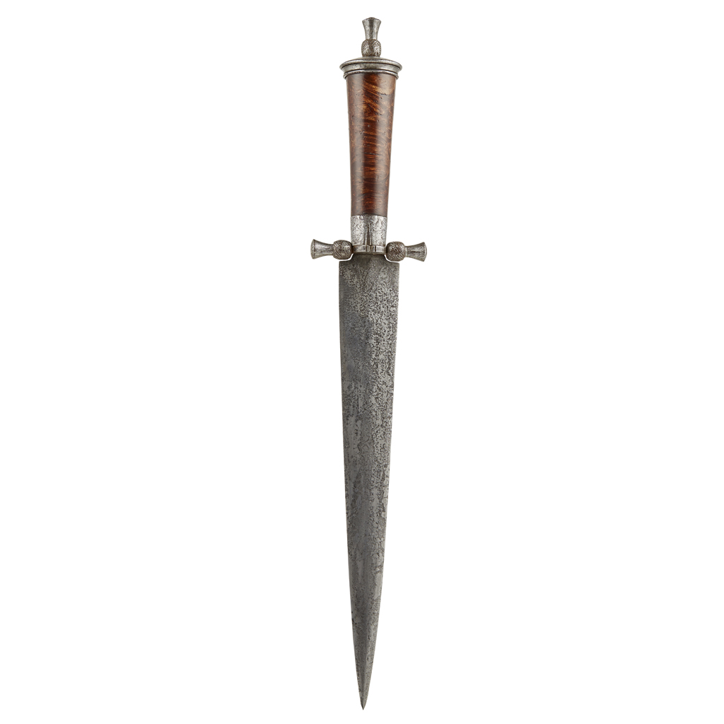 with a cut steel thistle on the pommel and the two cross guards, round section root wood grip ,with shallow diamond section double edge blade tapering to a sharp point