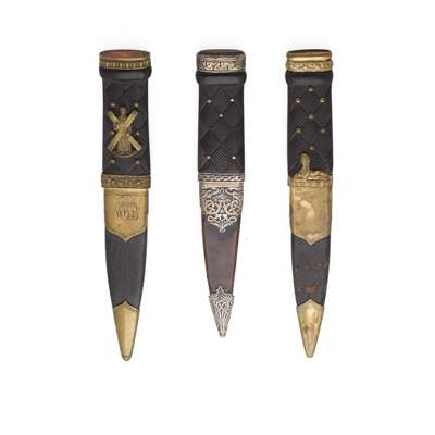 to include a brass mounted Cameron Highlanders example, a Seaforth Highlanders example and a silver mounted Argyll & Sutherland Highlanders example (3)