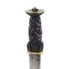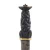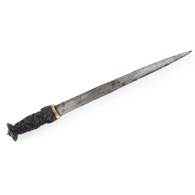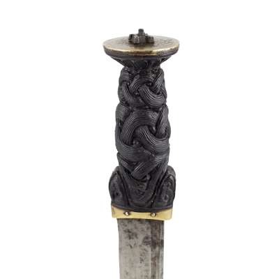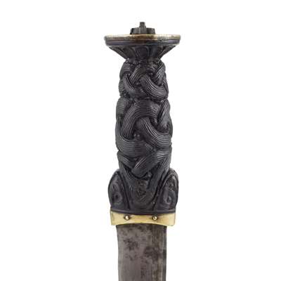 the carved bog oak grip with Celtic interlace and scallops underneath the pommel, brass mount and pommel cap, the blade formed from a cut down sword blade with flat back edge and single fuller