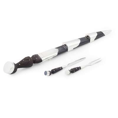 carved wooden handle set with plain pommel cap, single fullered blade, the leather scabbard with plain mounts and bi knife and fork