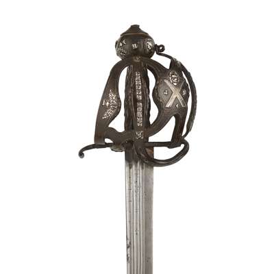 The spelling of 'Schotland' has long been explained by the manufacture of the blades in Germany before their movement to Scotland to be hilted, a common practice on the 17th and 18th centuries. It is believed that a group of blades, engraved with strong Jacobite sentiment, were commissioned on the Continent for distribution around Scotland to capitalise on the growing anti-Union sentiment. The mounting of this particular blade on such a prestigious hilt may be a reflection of the high status, perhaps even Royal connections, of the owner.
