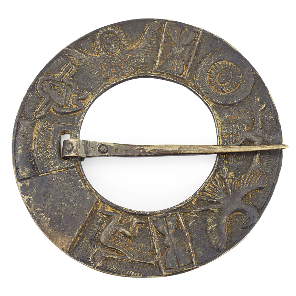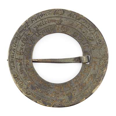 in an 17th/18th century style, the annular brooch with cast detail of figures and animal, the reverse inscribed