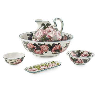 comprising a EWER AND BASIN, ewer 25.5cm high, basin 41cm diameter (hairlines); and TWO SOAP DISHES, 18.5cm diam. and 14.5cm; together with a PEN TRAY, 24.5cm wide (chip to corner); variously marked (5)