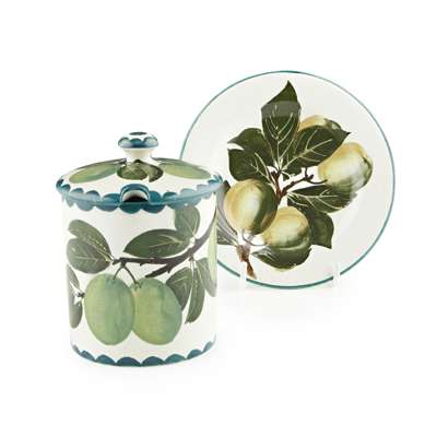 the jam pot with impressed mark WEMYSS, printed retailer's mark for T. GOODE & CO, 12.5cm high; and the saucer with impressed mark WEMYSS WARE/ R. H. & S., and printed retailer's mark, 14cm diam. (2)