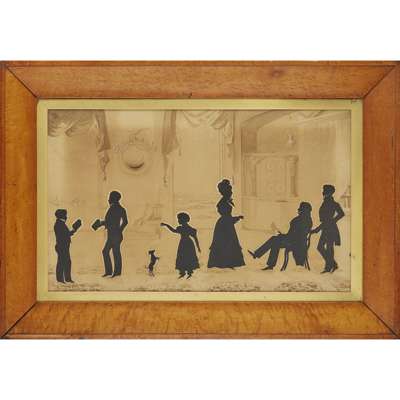 Note: A skilled portraitist who mastered the art of silhouette making, French-born Auguste Edouart initially began his career producing portraits from hair. After resigning from his position in Napoleon's army, Edouart travelled extensively around Europe and America where he developed his skill at free-hand paper cutting, producing life-like portraits in minutes. Edouart settled in Edinburgh for three years in 1829, producing around 5,000 silhouettes during this time. Much of his work features a number of profiles in large groups rather than individual sitters, illustrating his ability to represent a range of ages and social types. In this example, the complex composition depicts several generations, as well as the family's servants and their pet dog, set within an elaborate interior. Throughout his prolific career, Edouart's reputation gained him many commissions from high profile individuals such as Victor Hugo and Sir Walter Scott.