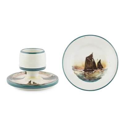 impressed mark WEMYSS, printed retailer's mark T. GOODE & CO., 12cm diameter; and a SMALL WEMYSS WARE 'FIFIES' PLATE, CIRCA 1900, impressed mark WEMYSS WARE/ R. H. & S., underside rim restored, 12cm diameter (2)