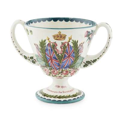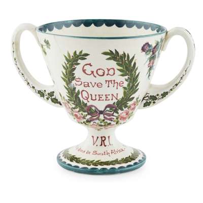 decorated with two flying British flags and the Royal Crown amongst flowers and foliage, bearing inscription GOD SAVE THE QUEEN/ 1899-1900/ VRI/ TO COMMEMORATE THE SUCCESS OF BRITISH ARMS IN SOUTH AFRICA, printed retailer's mark T. GOODE & CO., small hairline to rim