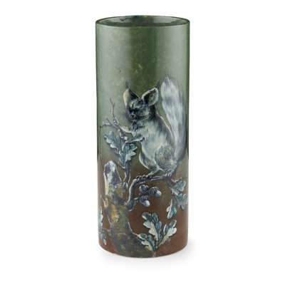 possibly decorated by David Grinton, depicting a squirrel perching on an oak branch against a green and brown ground, painted mark WEMYSS, restored