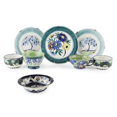 comprising a JESSIE MARION KING BOWL, decorated with red flowers within blue bands, with artists cypher and painted green gate marks, (hairlines), 16cm diameter; a PAIR OF BOUGH POTTERY BOWLS, dated 1923 and decorated with apples and leaves, 11cm diameter; THREE PLATES, two decorated by Elizabeth Armour for Bough Pottery 23cm diameter; the other by Mary Ramsay for Strathyre pottery, 25cm diameter; a TWIN-HANDLED BOWL, painted with flowers, 13cm diameter; and a further BOWL, bearing inscription DO MUCH/ SPEAK LITTLE, 13cm diameter, all variously marked (8)