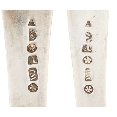 marked flower head, WJ, flowerhead, gothic A, thistle, A, comprising one small and one large, each of long Fiddle pattern with engraved crest and motto for Grant (5)
