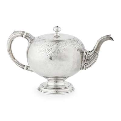 of conventional bullet form with flat chased border of acanthus leaves and foliage, the cover with ball finial and similar decoration, leaf clasped spout, C scroll handle, raised on a stepped domed foot