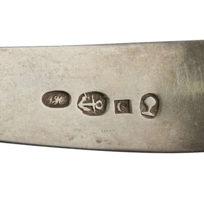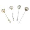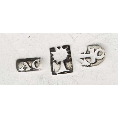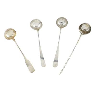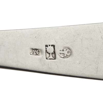 marked AC, oak tree, anchor; marked TD, anchor, O, oak tree, both of Old English pattern, italic initials engraved to terminal; together with another, John Heron marked JH (in script), anchor, G, oak tree, of Fiddle pattern with vacant terminal, the other, William Clarke, marked WC, anchor, oak tree, part twisted stem with ball finial and deep circular bowl (4)