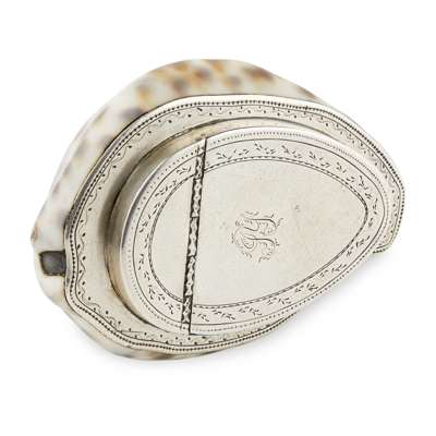 marked IA, S, S, INS, the polished cowrie shell mounted with flush hinged cover with fine borders and foliate initials