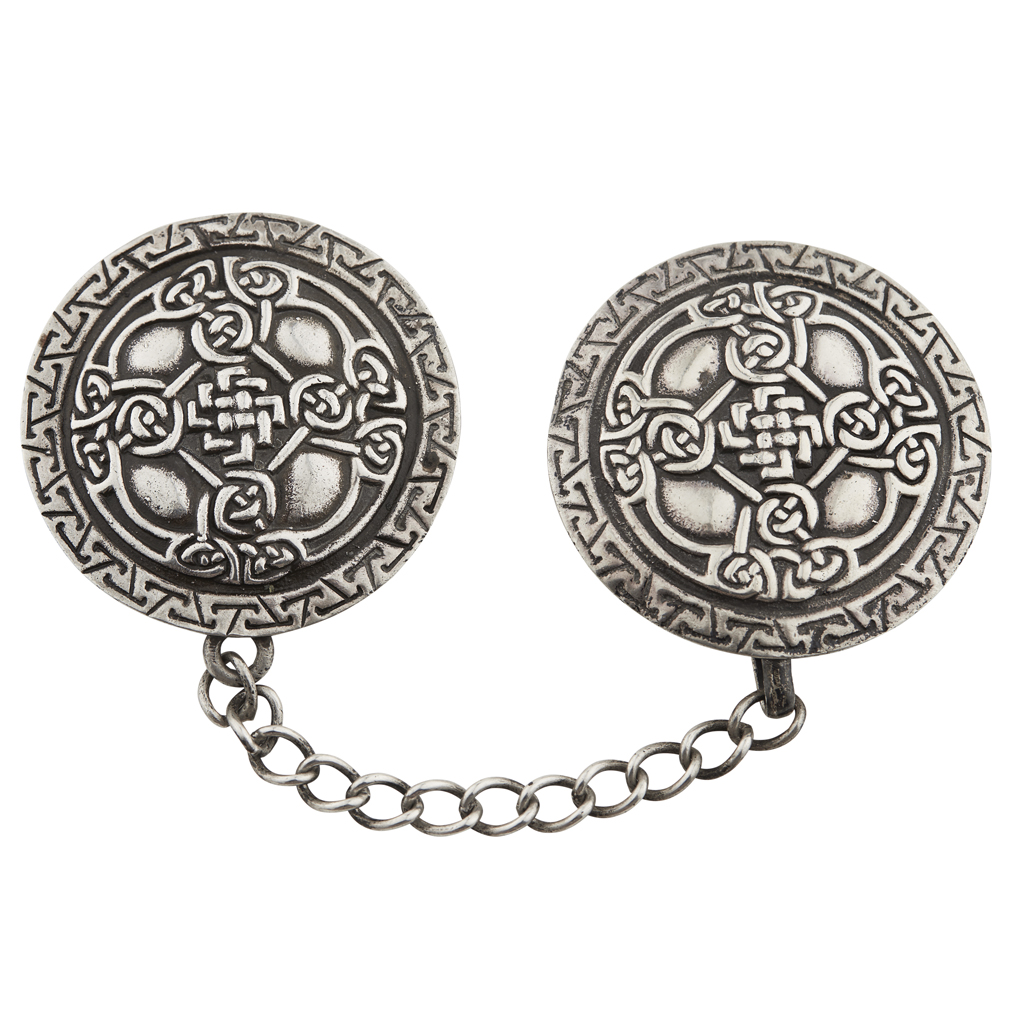 marked AR/ IONA, Glasgow 1908, each of circular form, cast with Celtic knotwork, with chain suspension