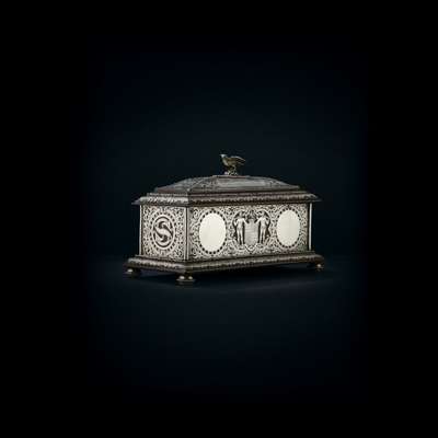 inscribed 'Designed and wrought by David MacGregor, Perth', the rectangular oak casket with applied silver panels and borders each profusely pierced and engraved with acanthus border and fine foliate and scroll interlace panels, the front panel with full armorial, the cover with cast heraldic eagle, the presentation panel inscribed 'Presented to The Honourable The Master of Strathallan by Tenants on Strathallan Estate on occasion of celebrating his coming of age 29th December 1892'