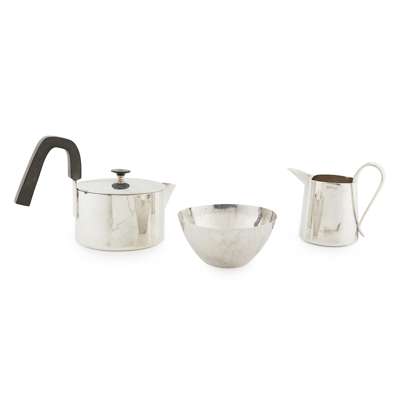 comprising a teapot, milk jug and sugar basin, all of circular form, the teapot with loop handle, pull-off lid, with circular finial, the milk jug with beak spout, the sugar basin with a planished finish (3)