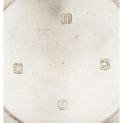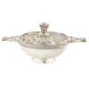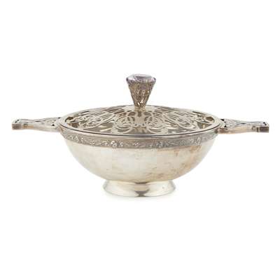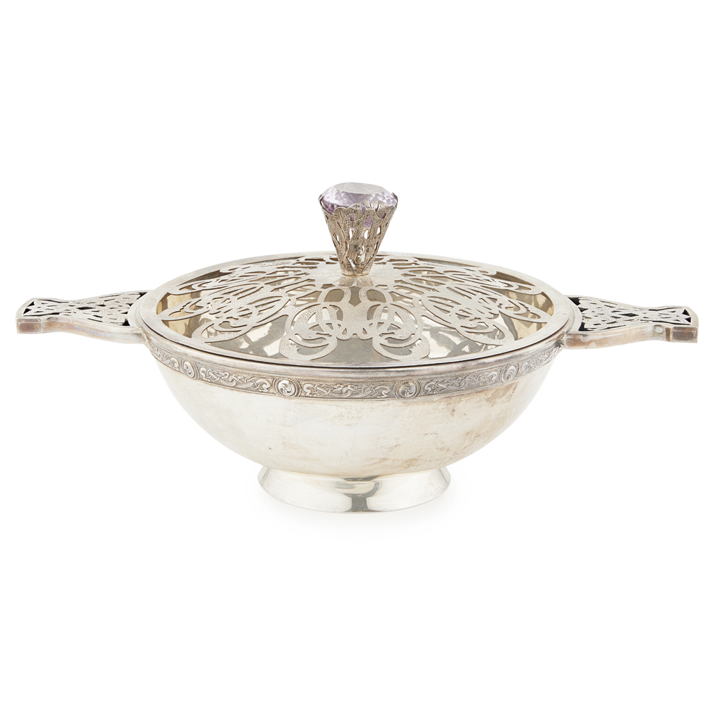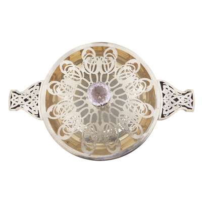 of traditional form, Celtic style border, the lugs with pierced Celtic beasts, the pull-off lid with pierced and engraved decoration and a raised set amethyst