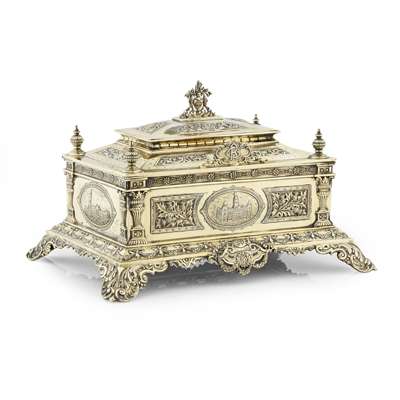 of rectangular form, with chased scenes of Glasgow landmarks to sides; floral and classical scrolls to hinged cover, Glasgow crest finial, raised on an outswept floral garland base with bracket feet, silk-lined interior with Burgess roll for Glasgow since 1800, and vellum presentation certificate awarded Robert Graham