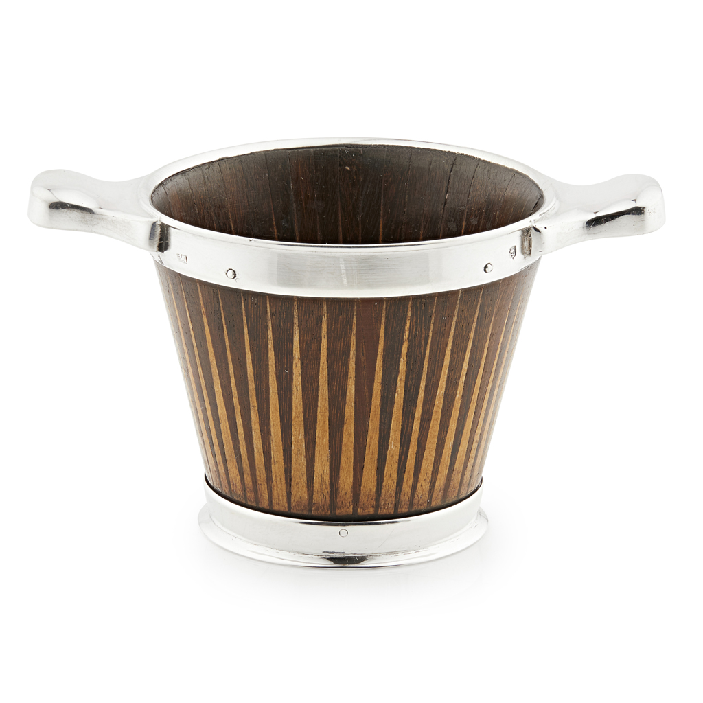 composed of fine alternating feathered staves, applied silver twin shaped lugs and banding