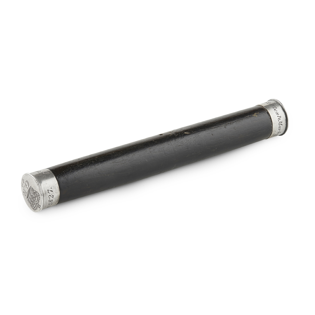 unmarked, the ebony cylindrical shaft with central ribbed mount, the end caps with cast foliate detail and engraved with VR and crown above and to base mount THIRD BAILLIE POLICE COMMISSIONER OF EDINR
