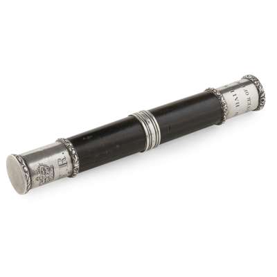 unmarked, the cylindrical ebony shag with simple capped mounts, the top mount with GR 4th with crown above and City of Edinburgh 1827, the base mount inscribed L Sutherland with Inspector of the Fish & Flesh Market
