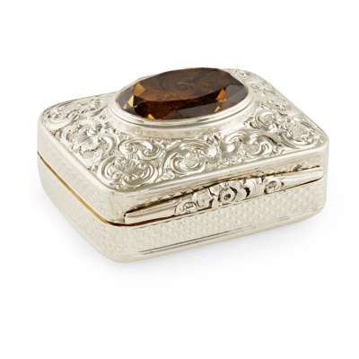 marked J, JN, N, of rounded rectangular form with slightly domed cover set with central oval facetted Cairngorm within chased scrolls and shells, the body and base with engine turned decoration, the interior gilded and with finely pierced and hinged grill